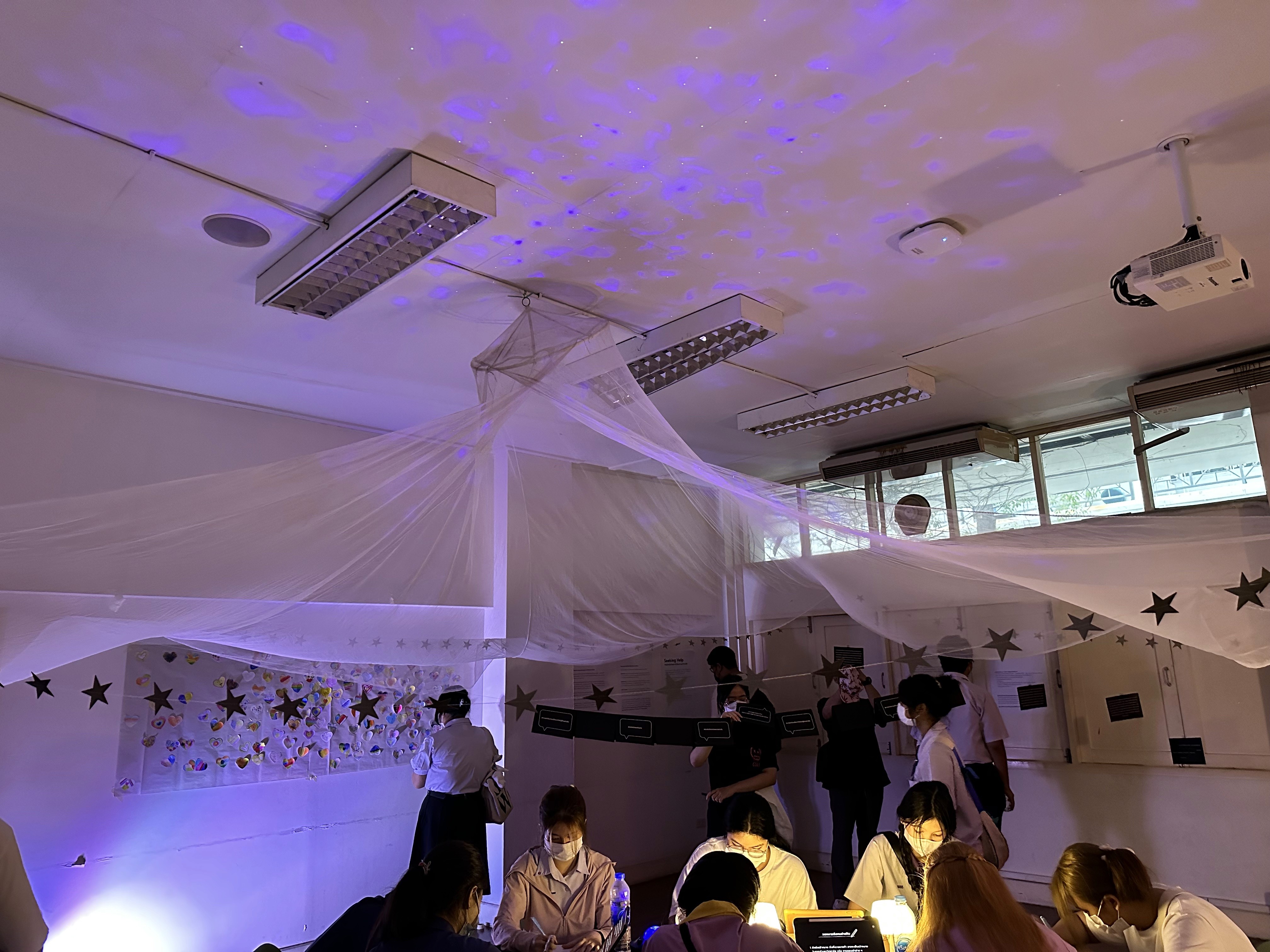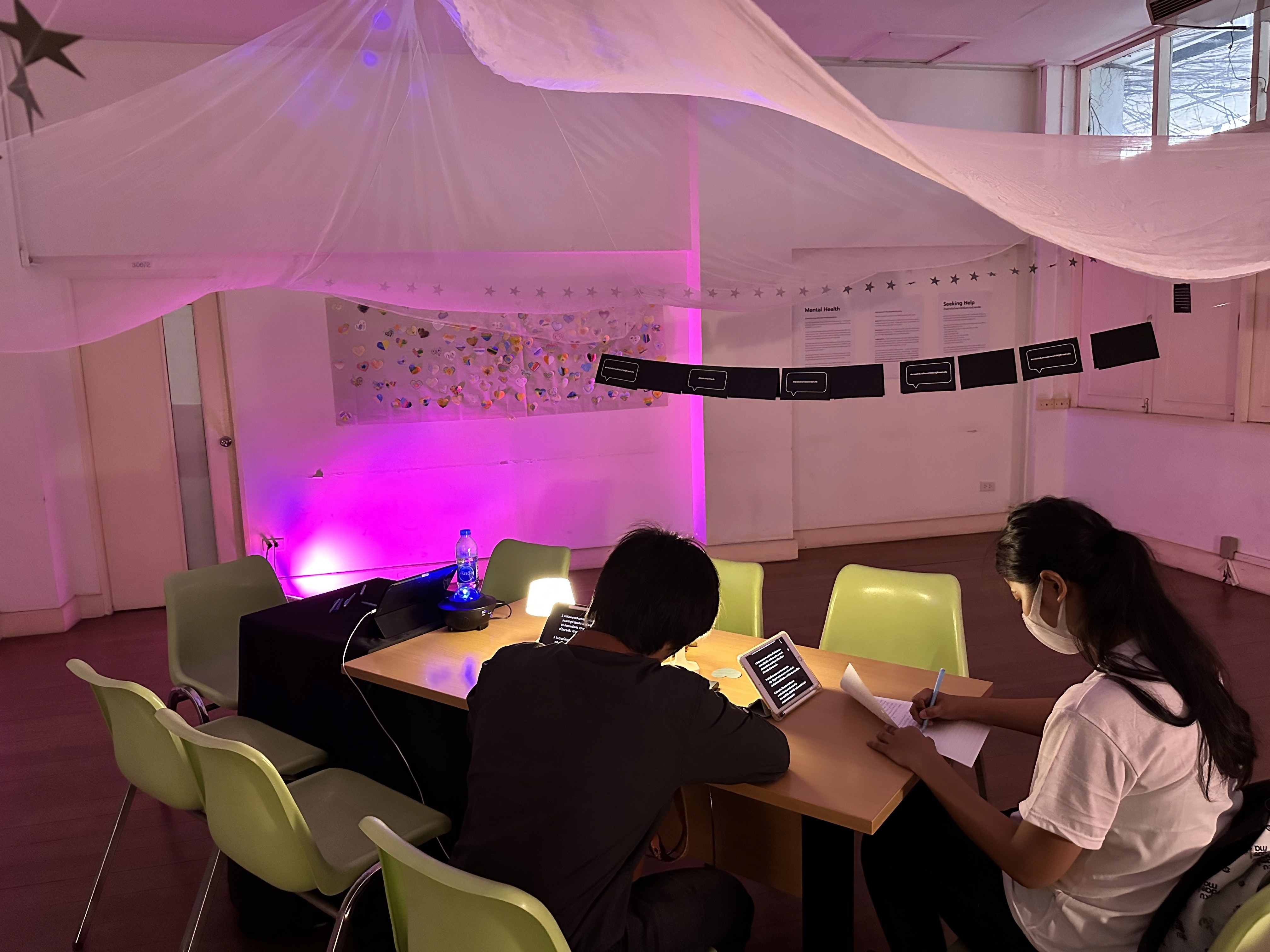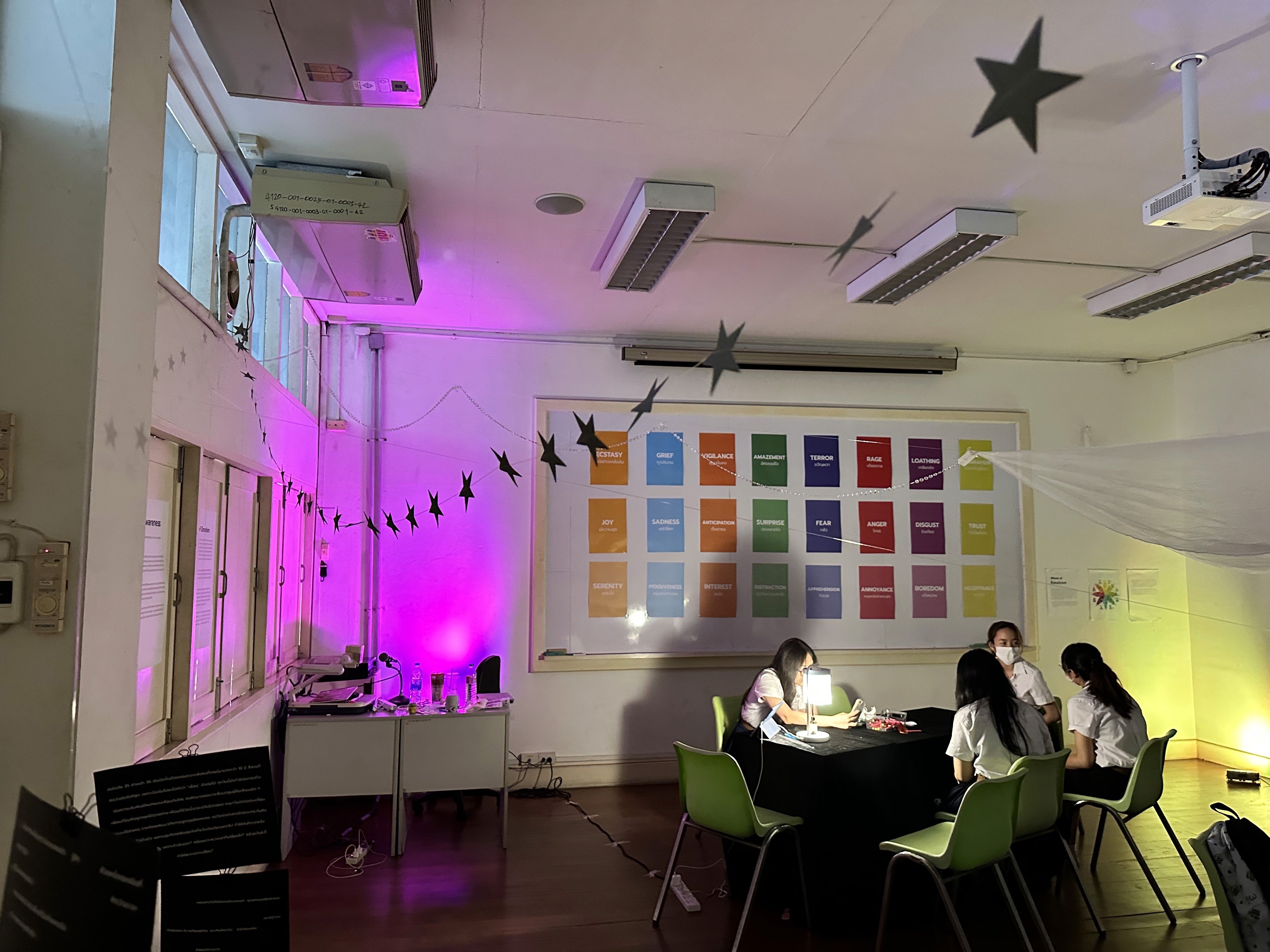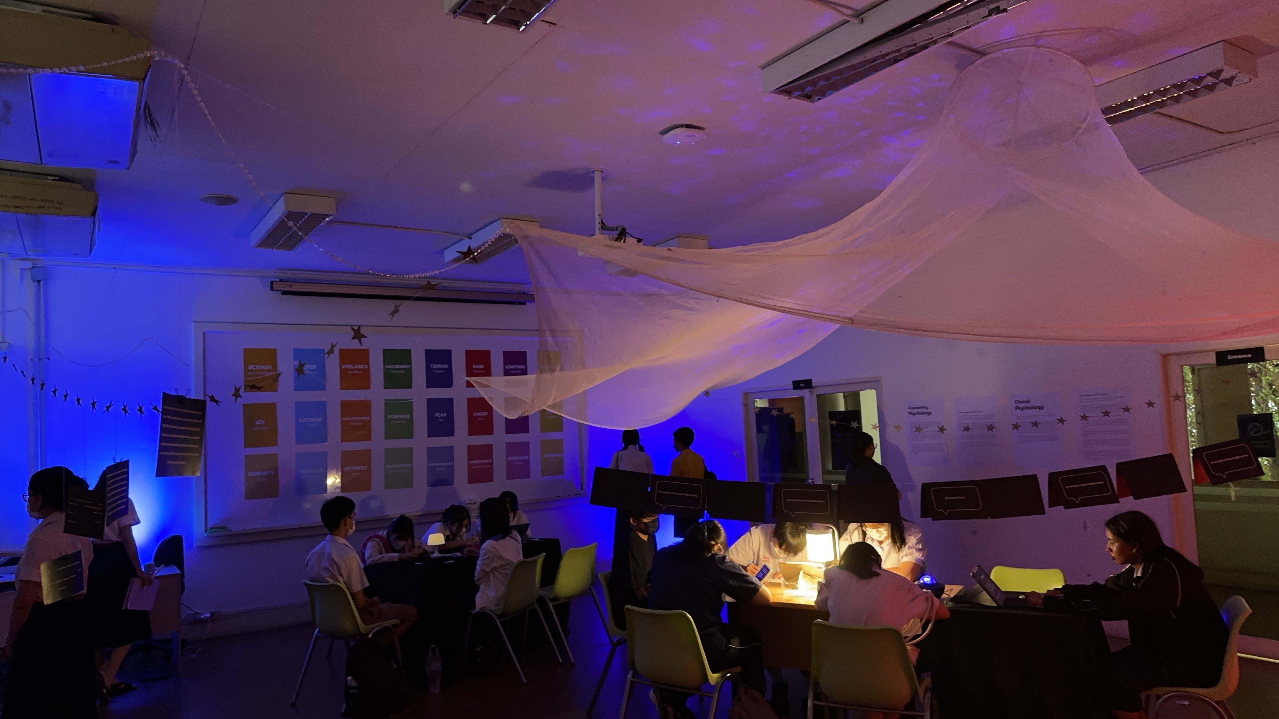 In terms of decoration, previously, the room was quite old and had a lot of light from outside. I decorated it by closing off various skylights and installing different colored light sources at the appropriate level for the activities in the exhibition. The room was decorated to have a comfortable atmosphere so that visitors could feel comfortable doing various activities and feel private.