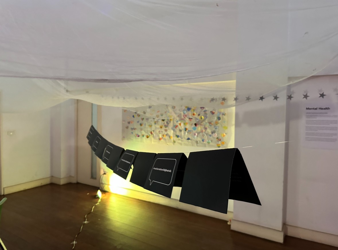 There are both information and activity in the last part. The information part is about the importance of mental health, psychological workers, and support system. The activity is for visitors to bring the heart-shaped paper they received from the first activity, come post it on the board at the end of the exhibition, and leave positive words to share with each other. This increased the sense of positive emotions of audiences at the end and reduced waste as well.