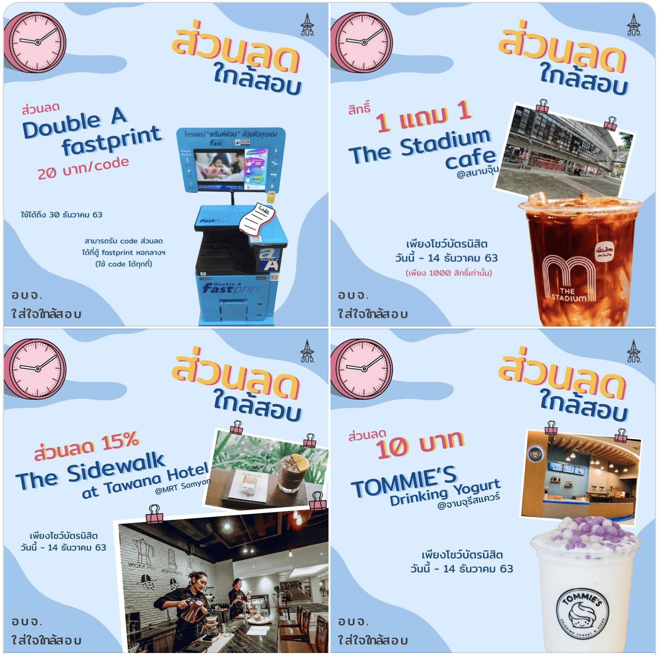 ซื้ออาหารและเครื่องดื่มที่ The stadium café, The sidewalk at Tawana Hotel และ Tommie’s Drinking Yogurtรับส่วนลดพิเศษจาก อบจ. ใส่ใจใกล้สอบและยังมีโค้ดส่วนลดจาก Double A fastprint มาฝากเพื่อนๆ ด้วยนะ