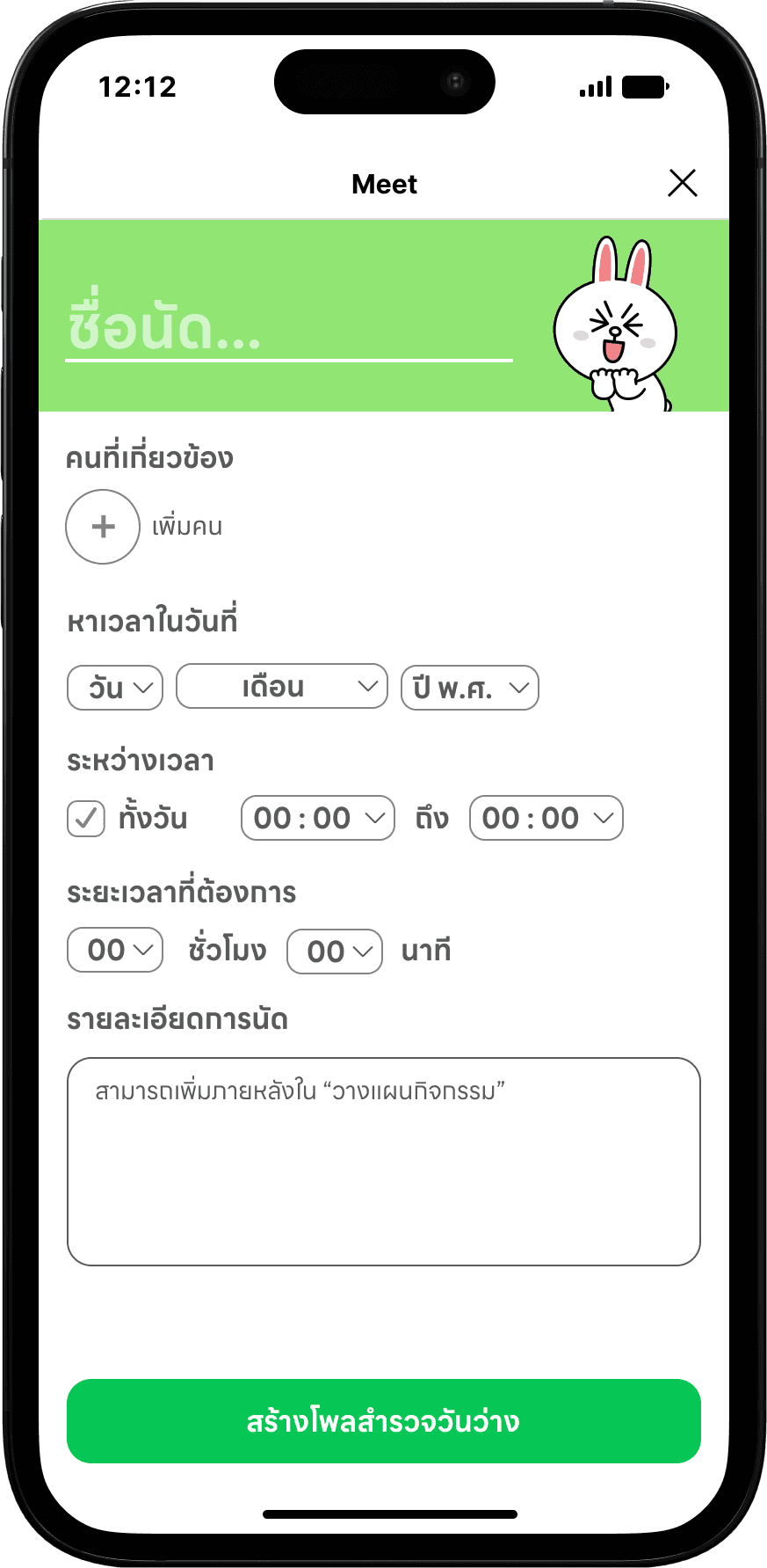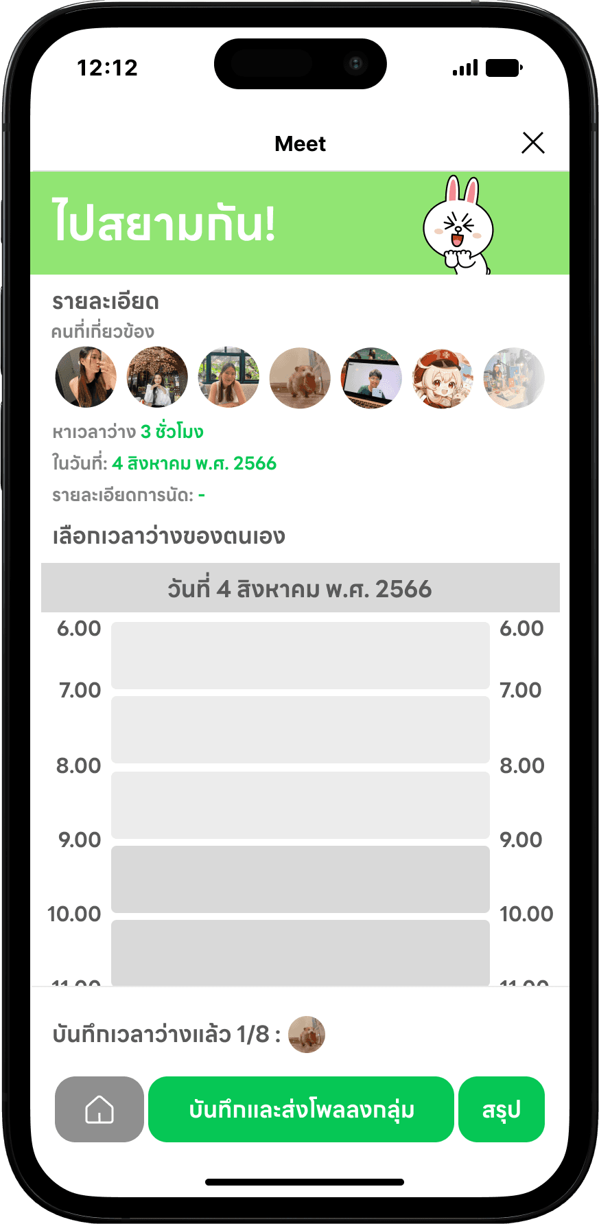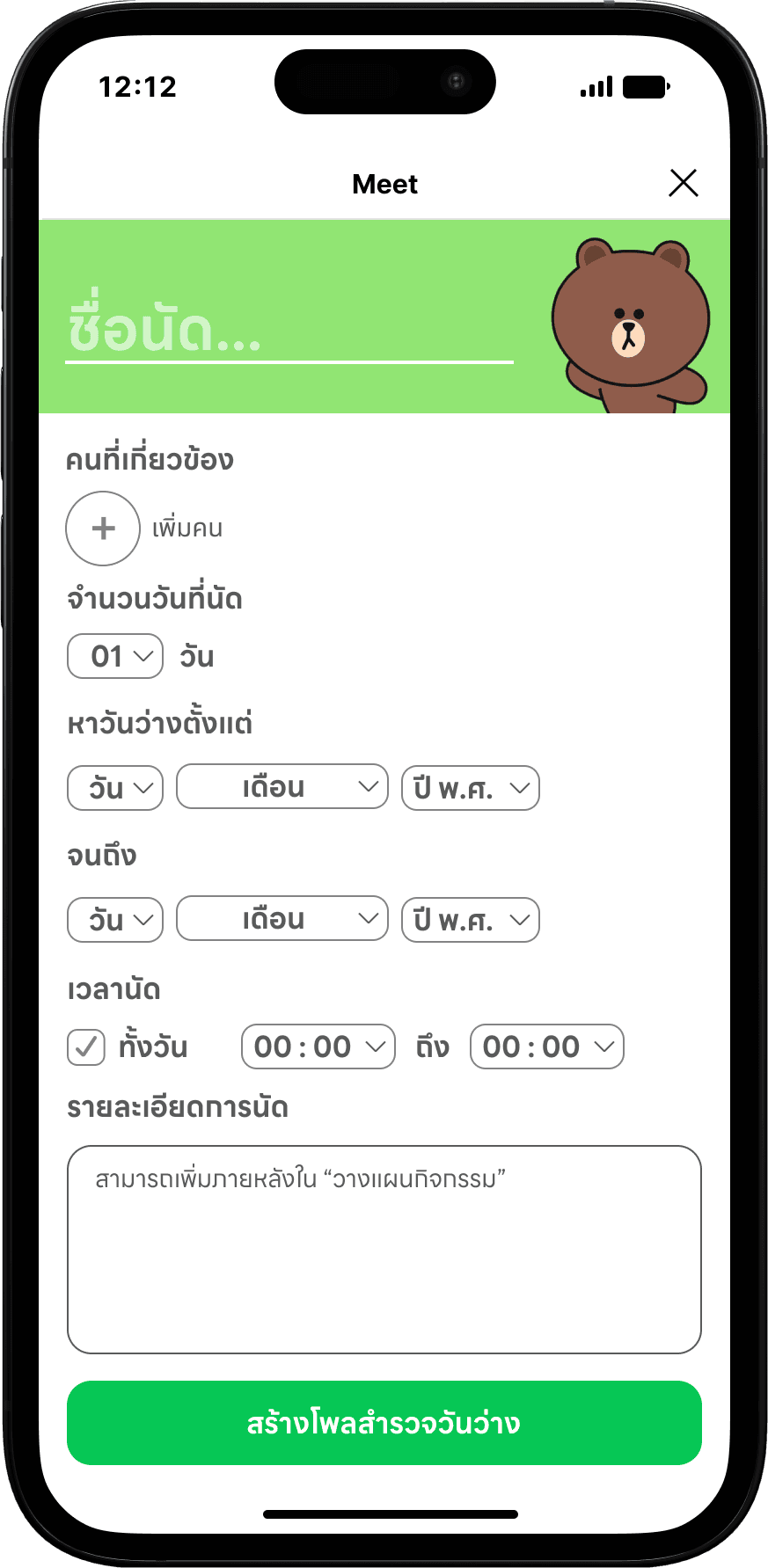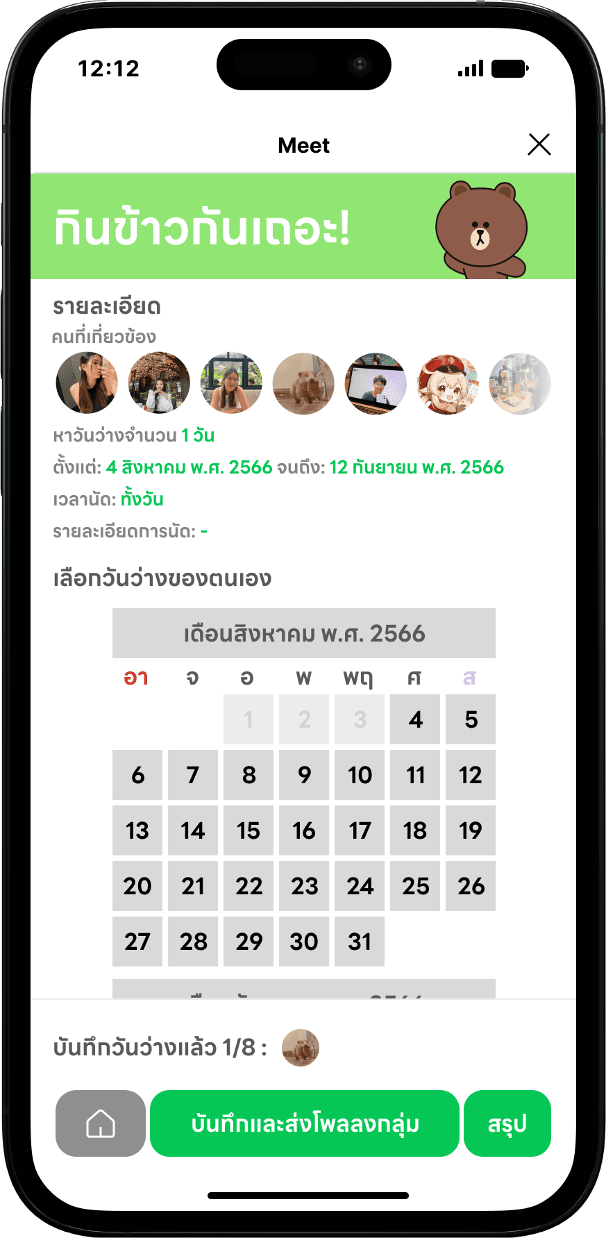 I designed Meet! using LINE Friends Characters to make it more attractive, and with the easy-to-understand flow. I tried to scope down the choices that users need to select. So, users will use the least effort to use Meet!. After the main user selects the period to appoint, Meet! will send down the flex message which contains the poll to other members in the group chat.